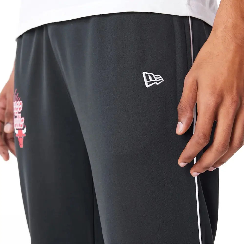 These black trousers have a piping detail along the legs, the Chicago Bulls logo on the right pocket and the New Era flag embroidered on the left pocket.