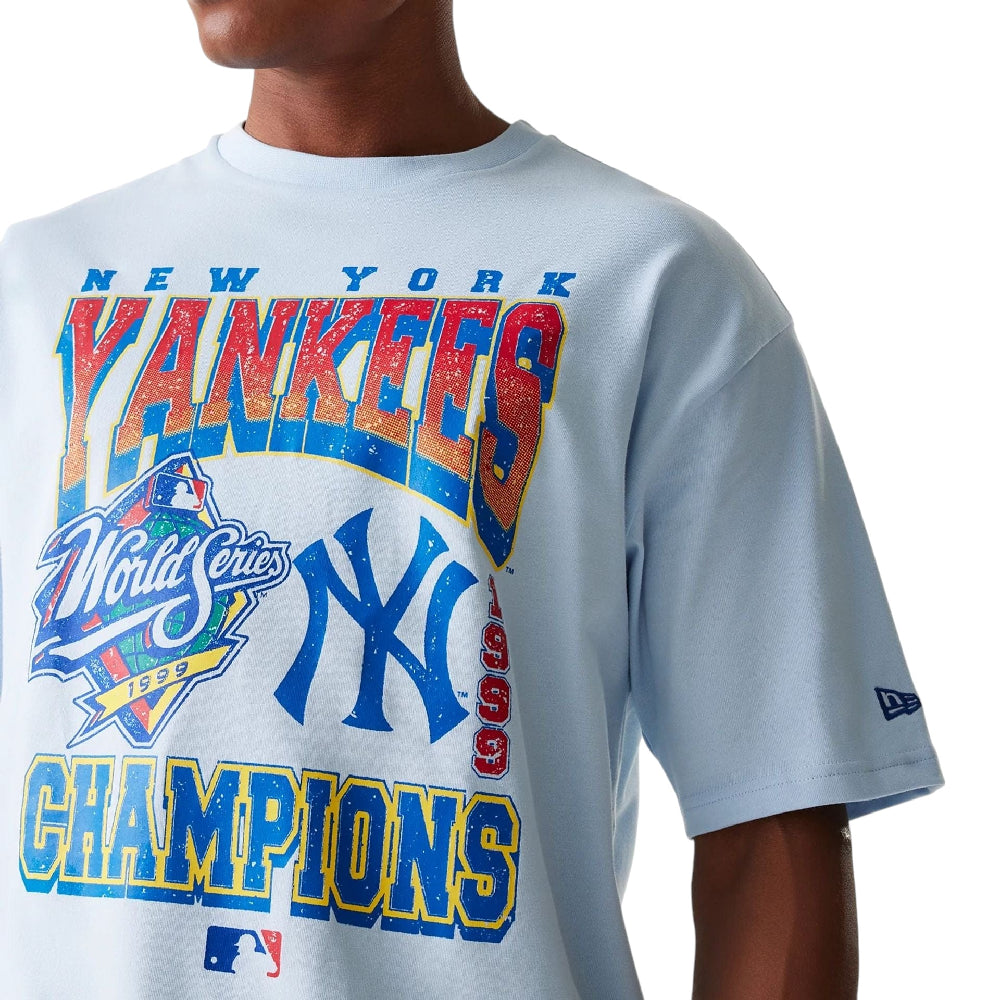 The New York Yankees MLB World Series Pastel Blue Oversized T-Shirt by NEW ERA is a bold statement piece rooted in baseball history and streetwear culture. Celebrating the Yankees' legendary legacy, this oversized tee features a striking World Series graphic and the iconic MLB logo, making it perfect for fans who want to showcase their team pride with attitude. Crafted from 100% cotton, it offers comfort and durability, while the unisex fit ensures a versatile, relaxed silhouette. Whether you're hitting the streets or the stands, this shirt blends sports heritage with modern style.